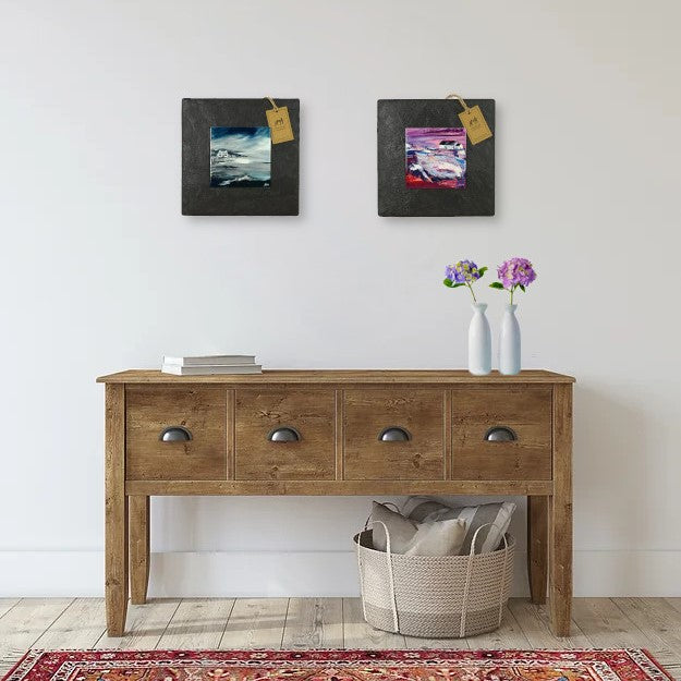In 2007 the Noa Art family moved from Scotland to New Zealand for six years. Over there houses are roofed with corrugated iron, giving many the appearance of an elaborate shed. Whilst they now think this style is great, it was a real shock at first. This experience gave them a deep love for the sturdy stone and slate of Scotland’s but ‘n’ ben’s, inspiring the art pieces and their slate mounts along the way
