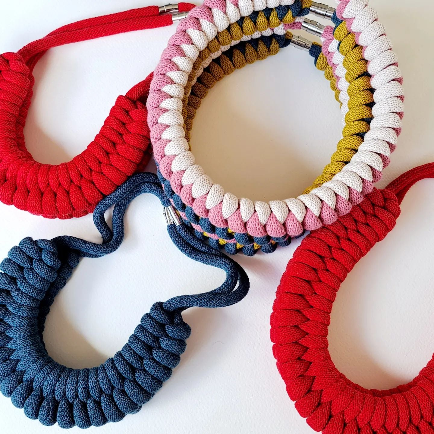 Based in Broughty Ferry, Sarah uses 100% recycled cotton in her textile jewellery, which