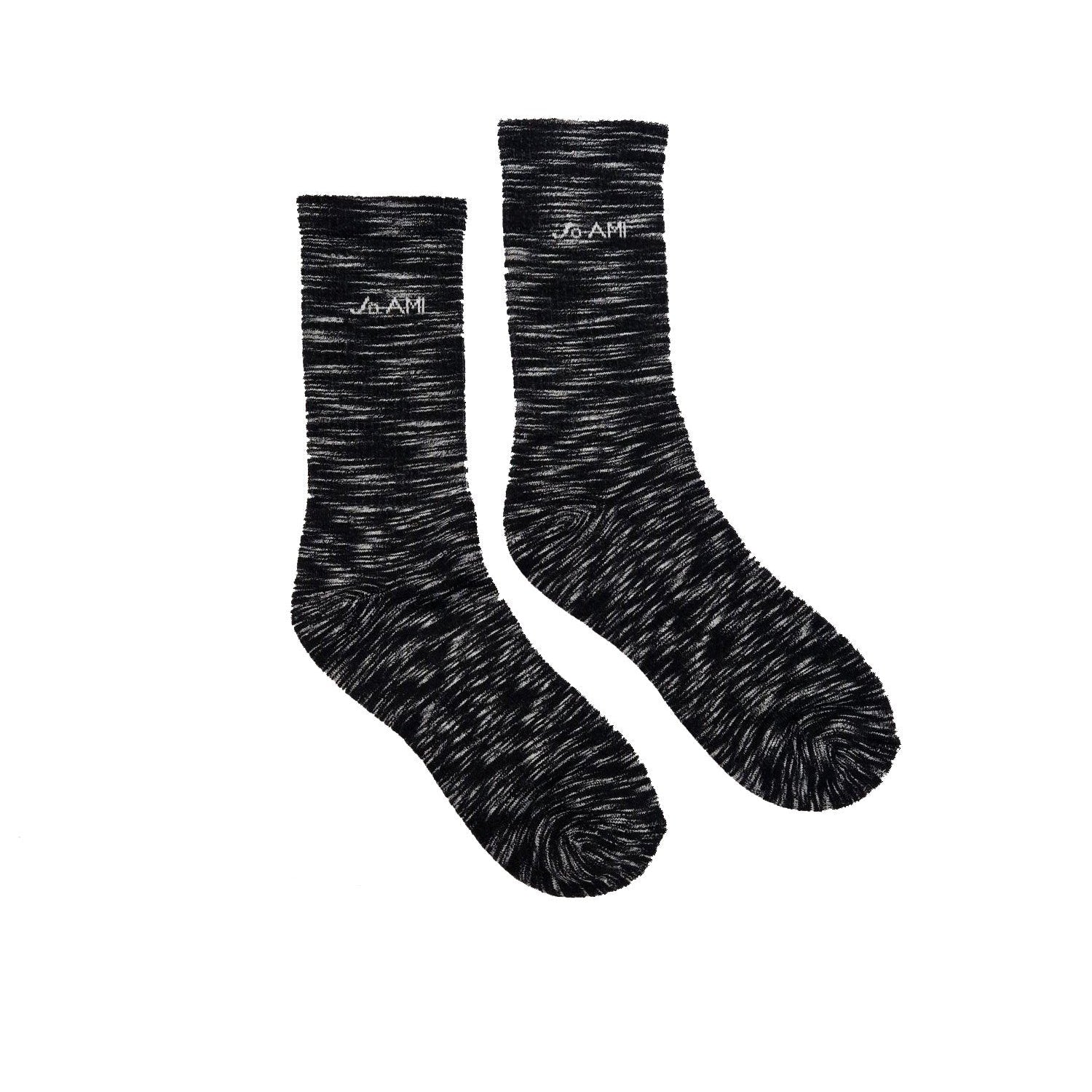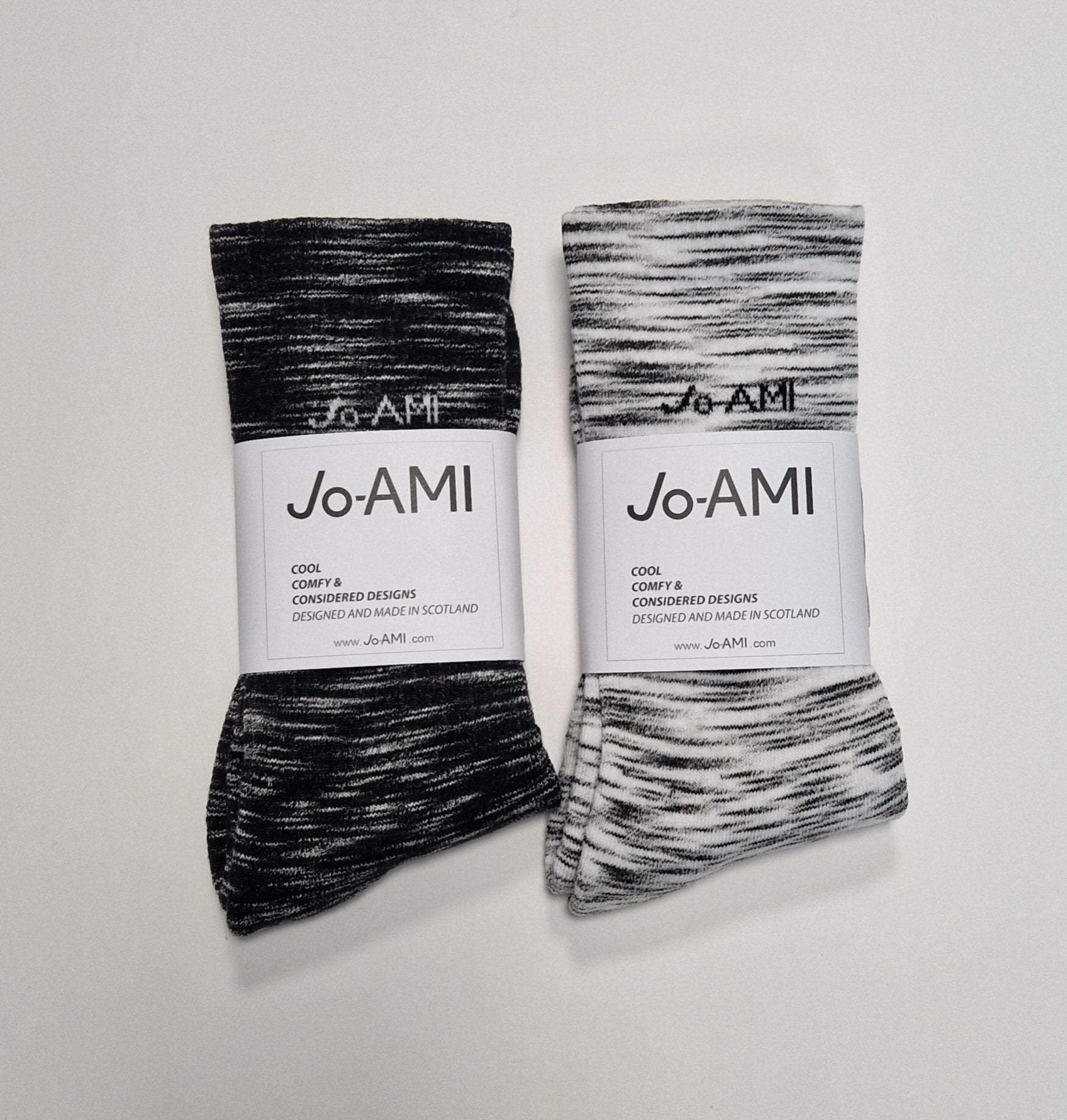 These super comfy socks have the signature JA logo on one side and Jo-AMI brand name on the other side knitted into the ribbed leg of the sock. These socks are knitted with a padded sole, ribbed arch and leg for ultimate comfort in a super soft deadstock yarn, utilising end of line yarns that would otherwise go to waste. The twist effect of the yarn creates a unique pattern when knitted up, giving each pair of socks their own look!