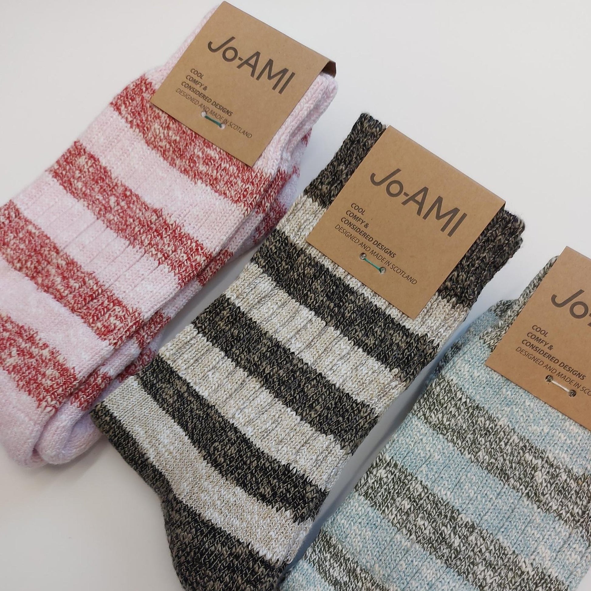 These super comfy socks have been knitted in textured yarn to give the signature Jo-AMI look. They are knitted with care and expertise, giving you an extra bit of warmth whilst looking great too! Looks great styled with Doc boots or even just wearing in the house with slippers for extra cosiness.