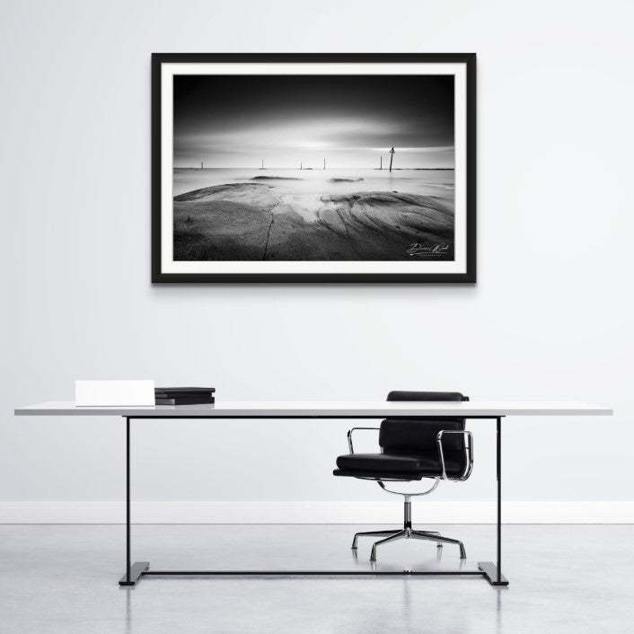 In this minimalist black and white long exposure photograph of Westhaven in Carnoustie, simplicity is key to capturing the scene's essence. Stripped to its core elements, the image conveys a profound sense of serenity and stillness.