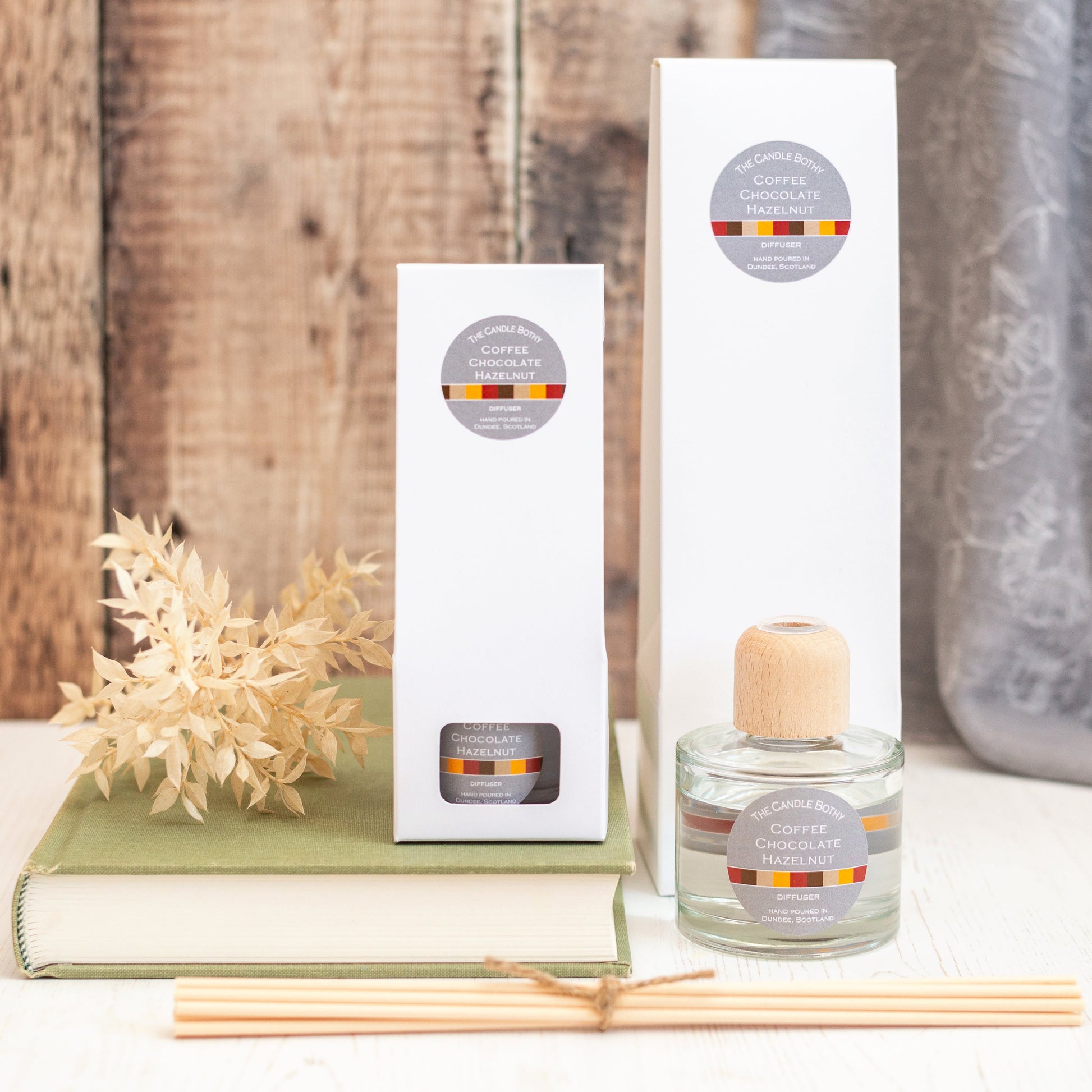 DIFFUSERS: come in clear glass bottles with natural coloured fibre reeds and are packaged in a white box which makes them ideal as a present. All diffusers are hand-poured in small batches in Dundee/Scotland.