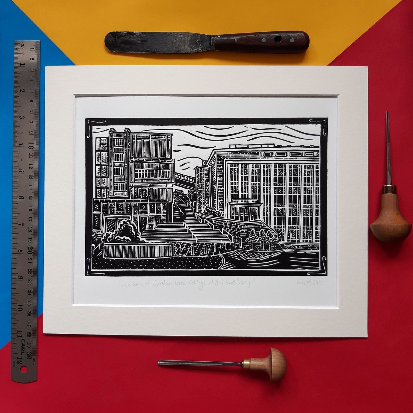 - Original linocut print by Pamela Scott of DJCAD from the Perth Road.