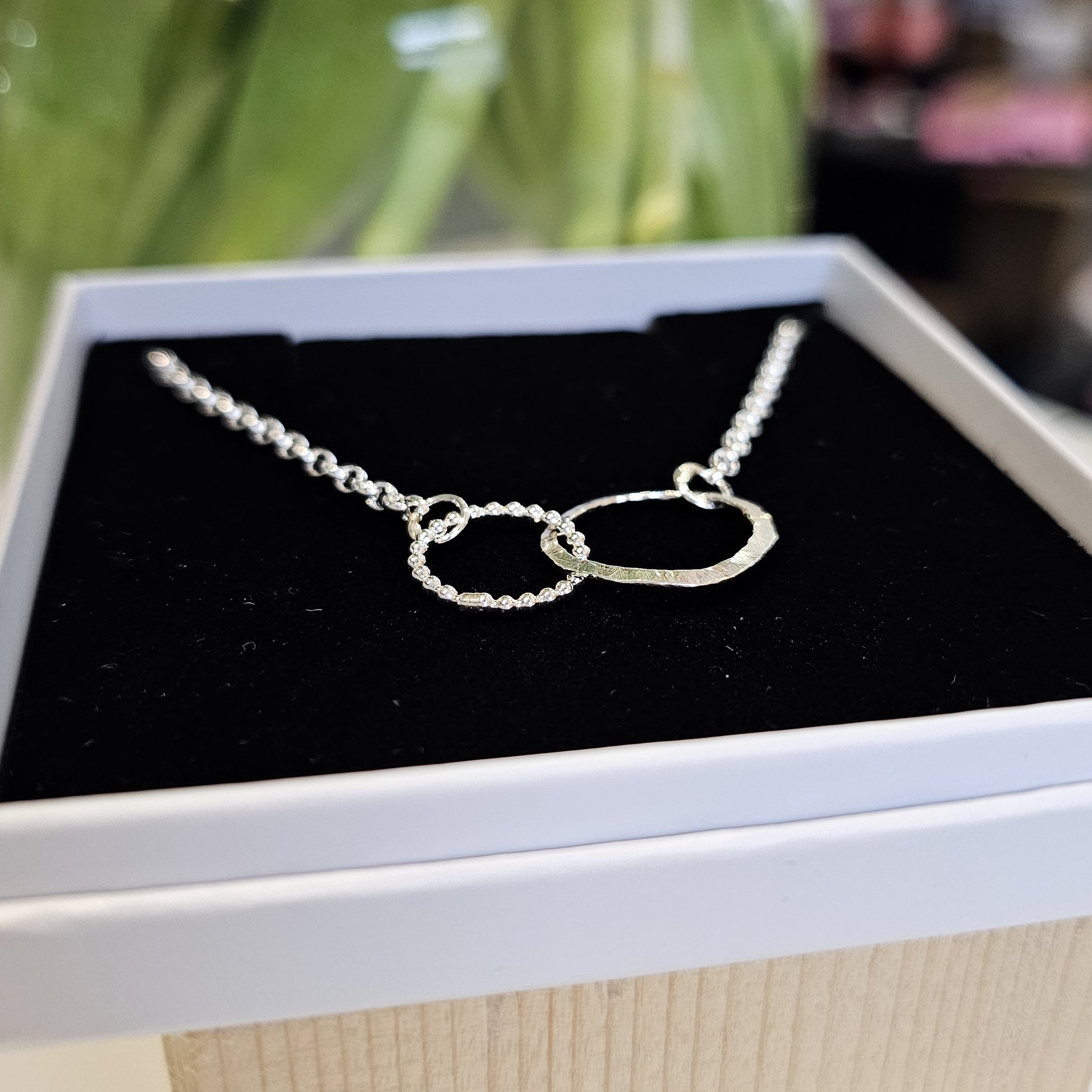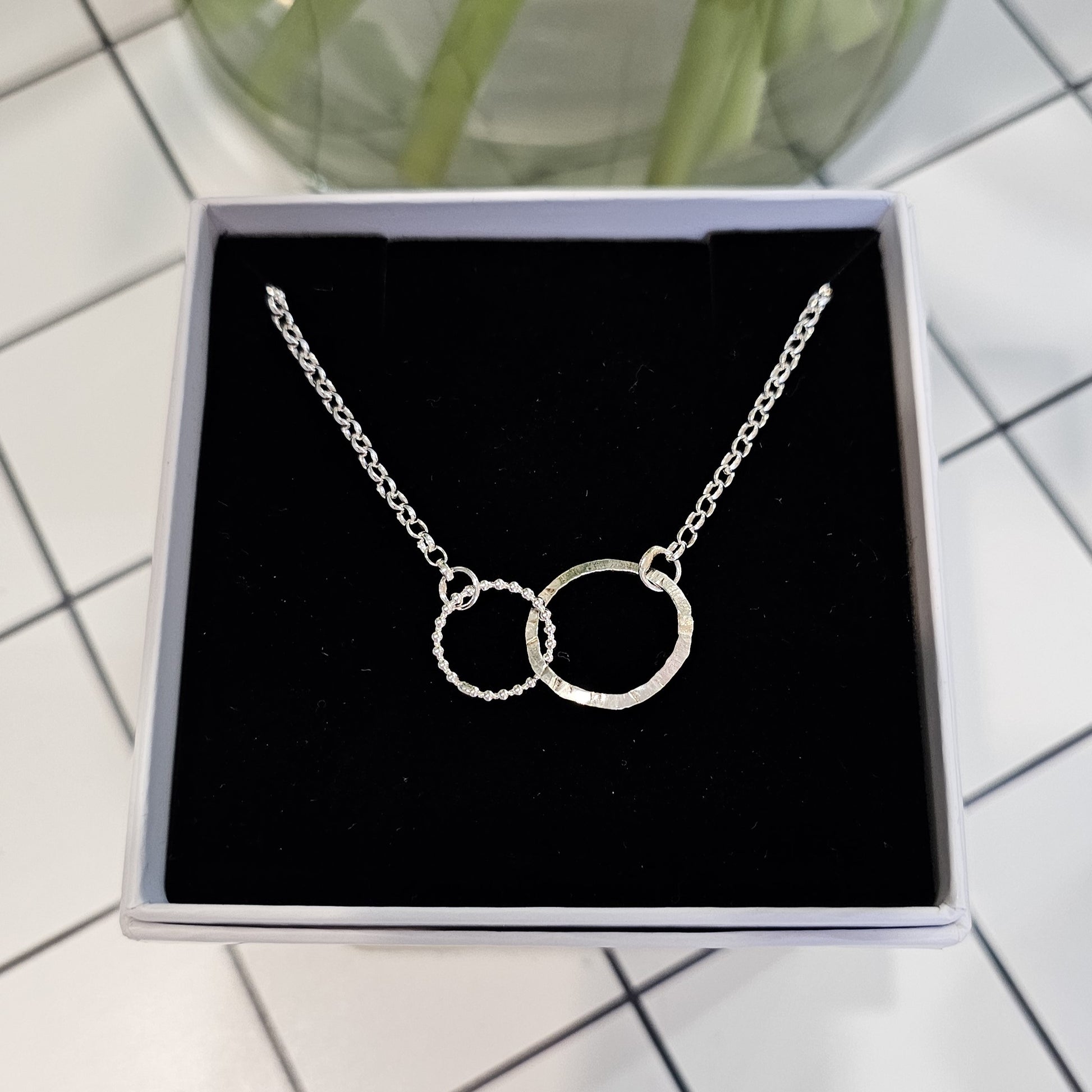 This beautiful necklace has two circles, one hammered, one beaded, interlinked on a split 18'' chain.