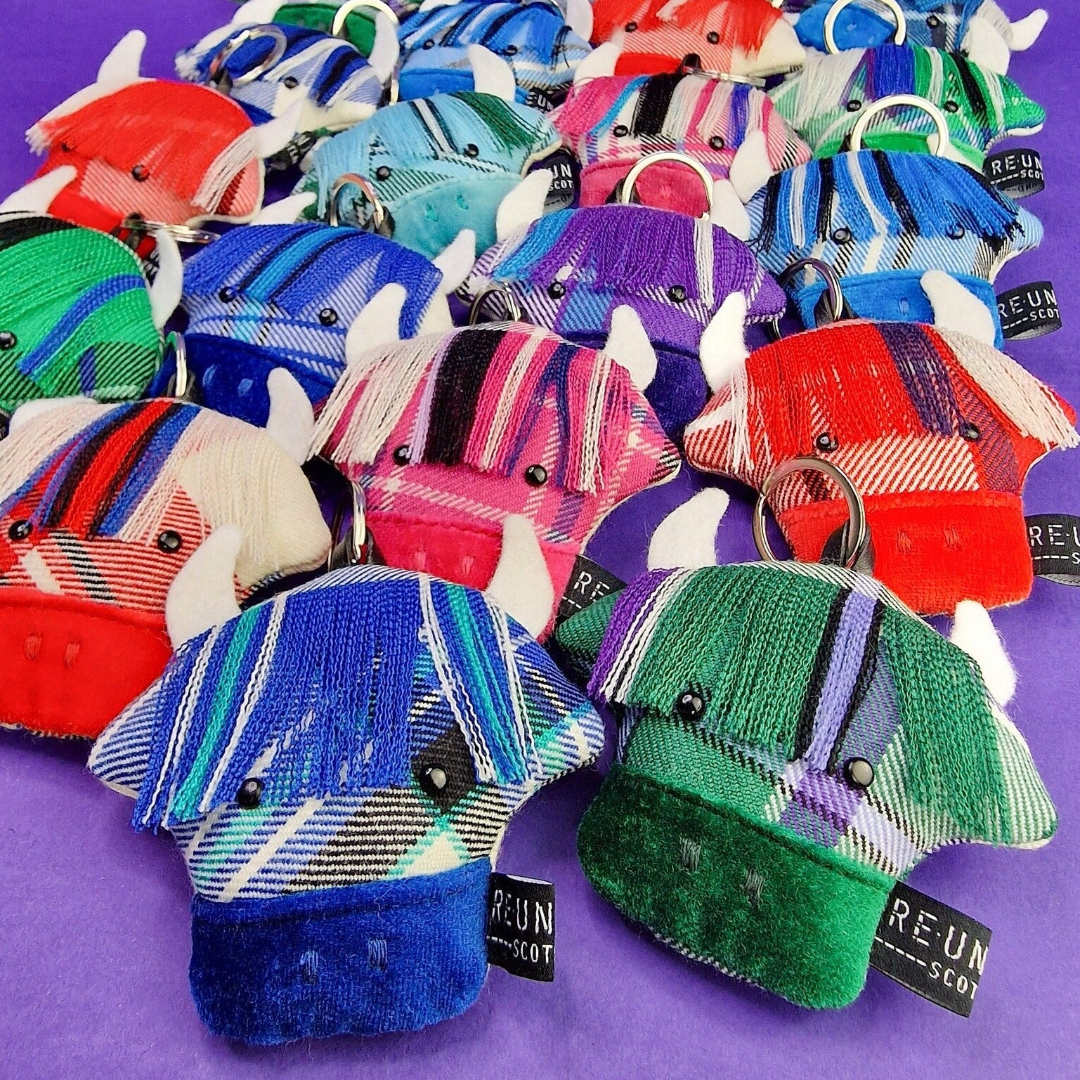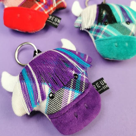 Quirky tartan keyring made from genuine wool tartan and velvet. A fun and colourful tartan accessory, perfect as a bag charm or gift to that person always losing their keys. This well know Scottish character is sure to brighten up your day.