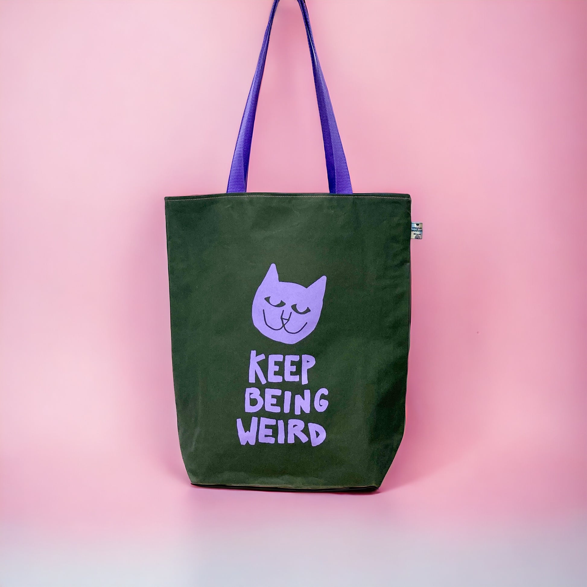 This printed tote bag is screen printed with neon pink or purple water based ink on waxed cotton canvas fabric saved from the landfill. Waxed cotton is water resistant fabric.