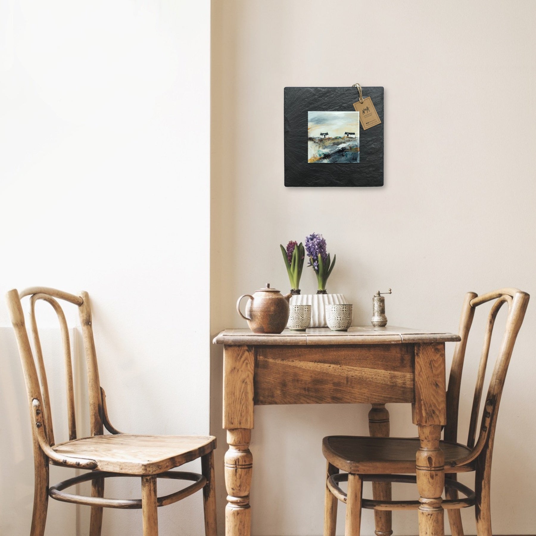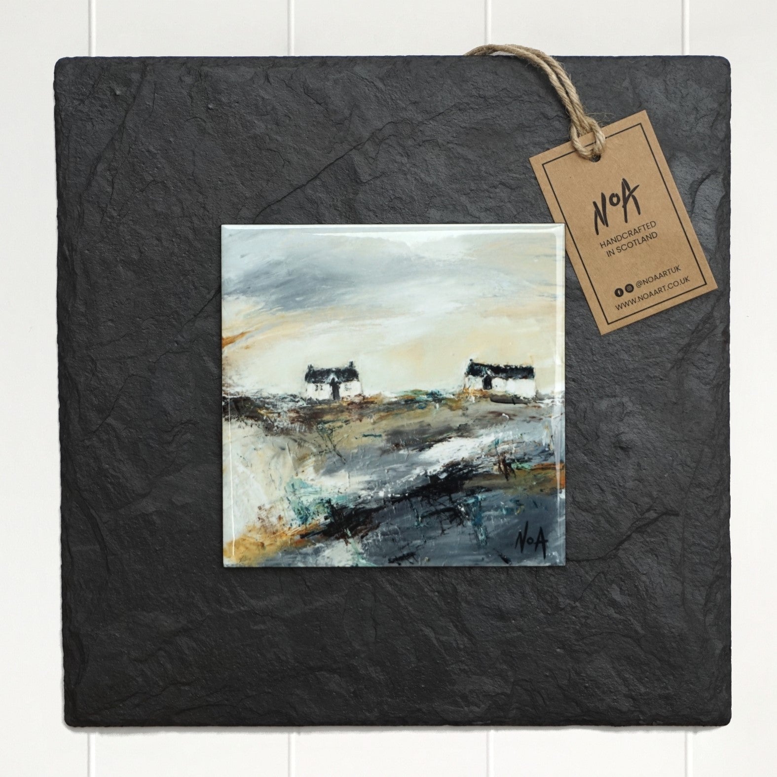 The original art pieces are photographed and then transferred onto ceramic tiles, this adds a beautiful gloss to the artwork which makes vivid their rich shades and colours. The tile is then mounted onto slate, which is hand cut and treated in-house to bring out its natural texture. Just like a snowflake, no two slates are the same, so your artwork will always be totally unique.