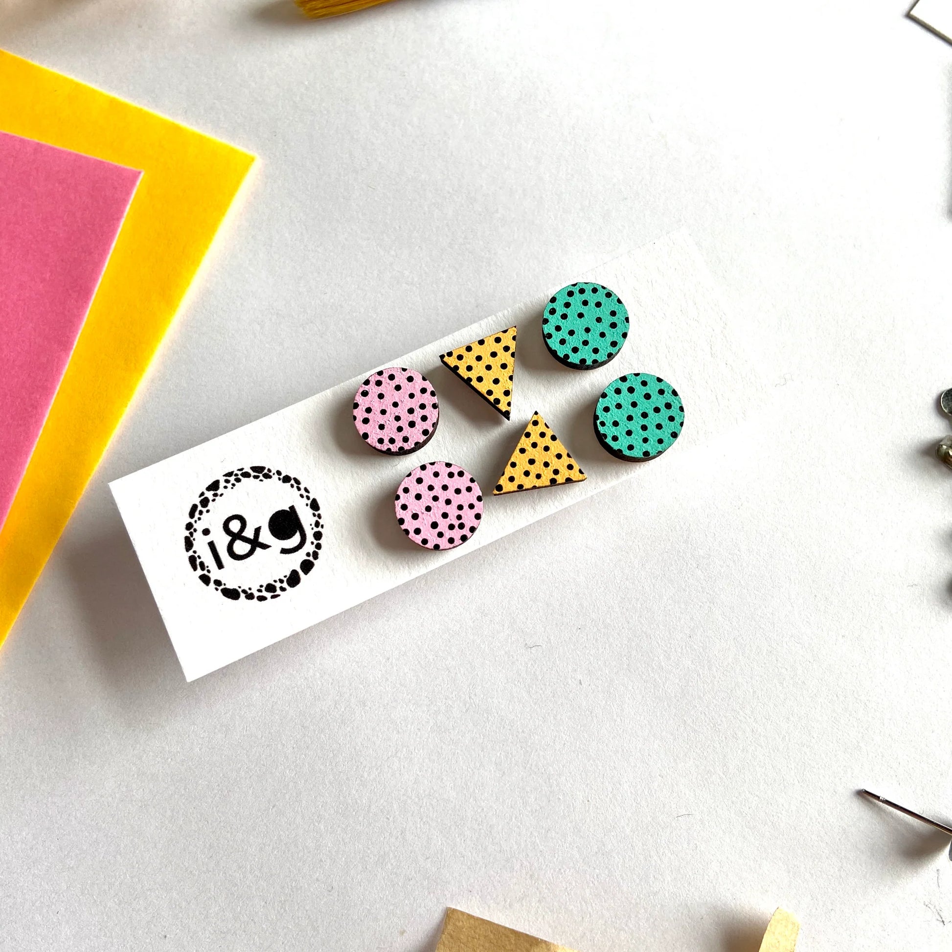 Set of 3 80's style mini studs, with silver surgical stainless steel posts and butterfly fastenings. Each 10mm diameter.