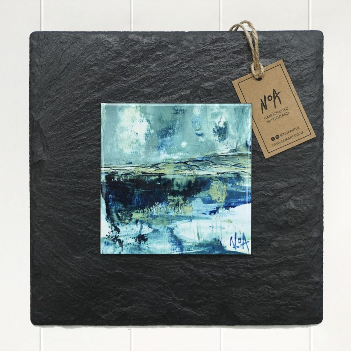 The original art pieces are photographed and then transferred onto ceramic tiles, this adds a beautiful gloss to the artwork which makes vivid their rich shades and colours. The tile is then mounted onto slate, which is hand cut and treated in-house to bring out its natural texture. Just like a snowflake, no two slates are the same, so your artwork will always be totally unique.