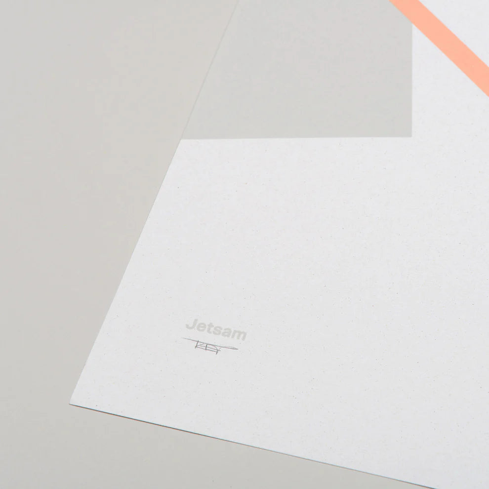 ‘Jetsam’ is an open edition signed A2 screen print, printed in coral, grey, navy and yellow on beautifully speckled heavyweight 200gsm Favini Corn Crush paper