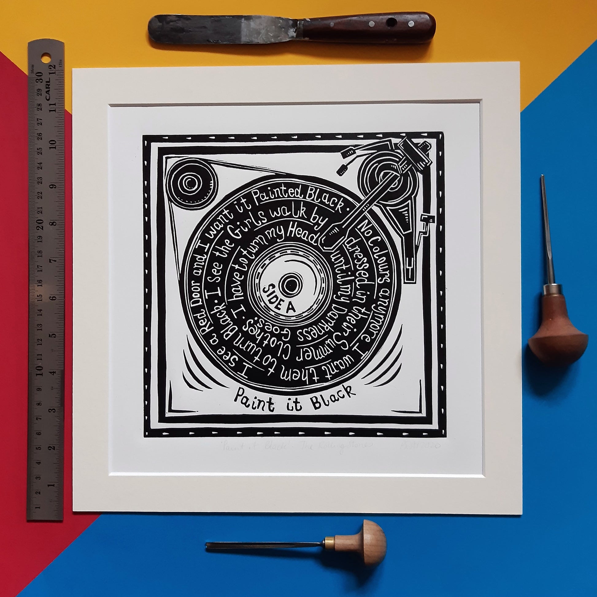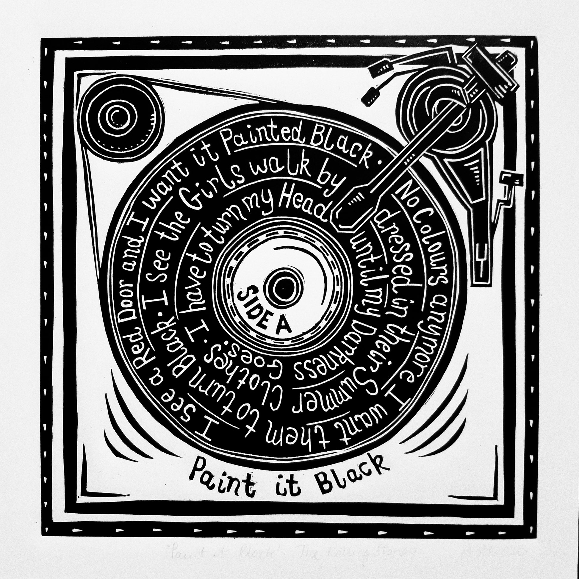 Original linocut print based on the song 'Paint It Black' by The Rolling Stones
