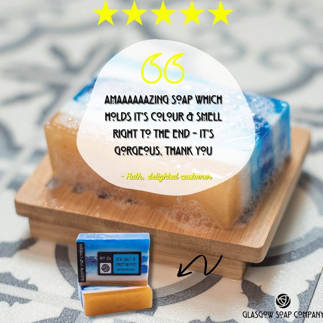Our sea salt & driftwood soap slice is fragranced with a mesmerising floral marine scent where refreshing notes of seaweed and green algae lie in cool rock pools livened by a fresh coastal breeze and enhanced by touches of cyclamen and water lilly. At the base of the fragrance, sparkling salt crusted driftwood is warmed by amber, patchouli and musk.